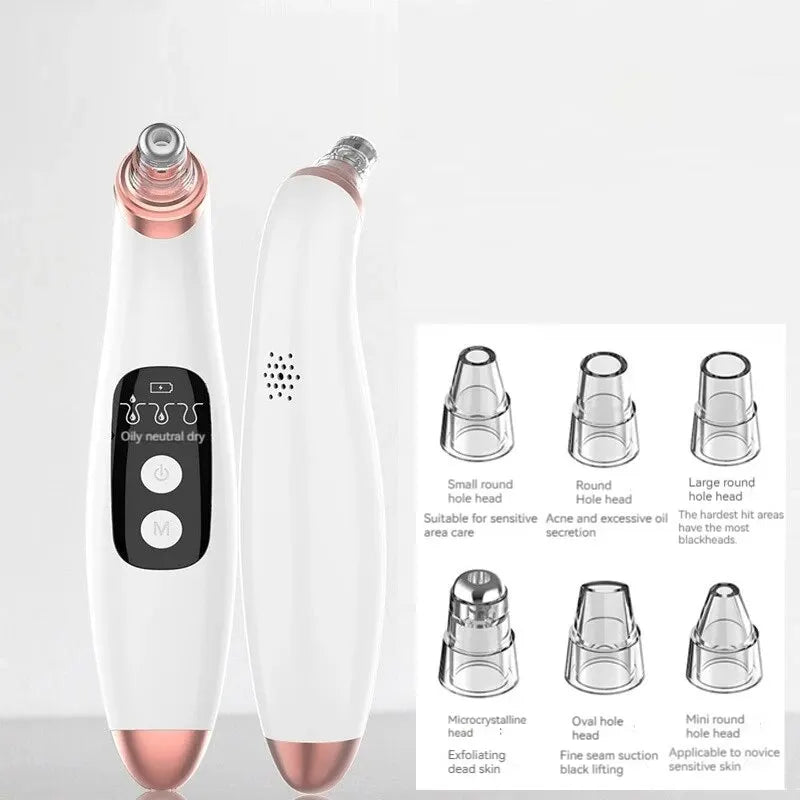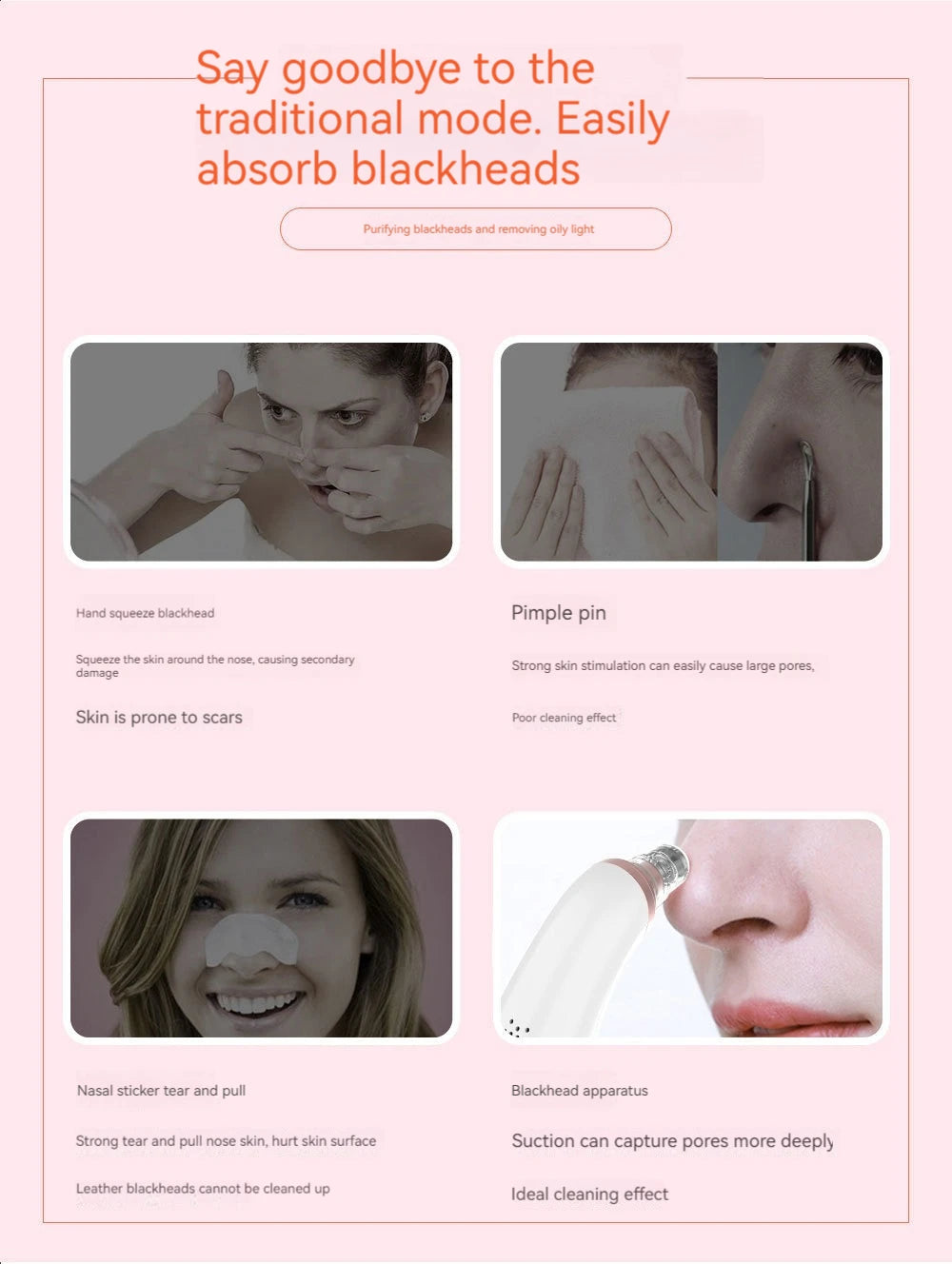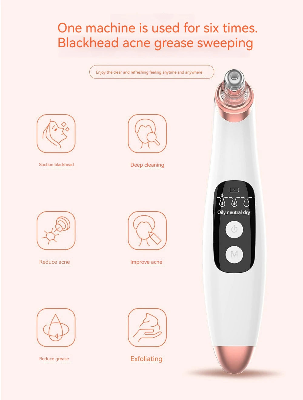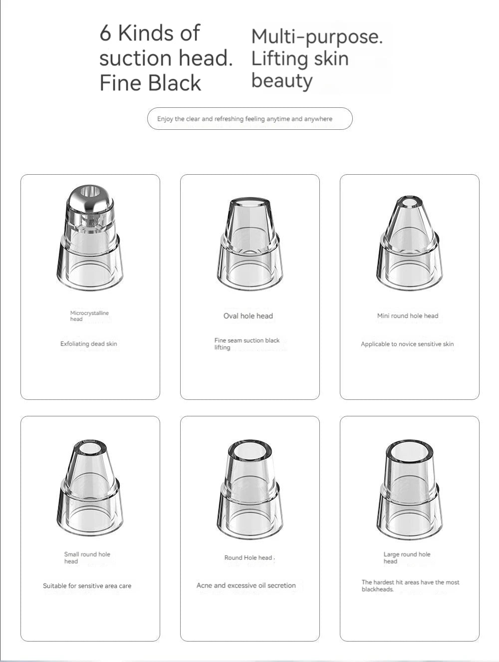 A machine six use, blackheads acne oil a sweep away, anytime and anywhere to enjoy a clear and refreshing feeling. Suck out blackheads, reduce acne, reduce grease, deep clean, improve acne, remove keratin. Say goodbye to the traditional mode, easily suck out blackheads. 6 kinds of suction head, multi-purpose, detailed black suction, lifting and beautifying the skin, enjoy a clear and fresh feeling anytime, anywhere. Suitable for a variety of skin types, choose different suction power according to your needs. Oily, low-grade suction, suitable for delicate parts; neutral, high-grade suction, suitable for removing blackheads; dry, mid-range suction, suitable for removing stubborn dirt; on/off switch, one-touch switch. Please be sure to apply a hot towel to your nose before use to open the pores and then apply the expelling solution. Drop the export liquid on a cotton pad and apply it hot, apply it to your nose for 5-8 minutes to soften the keratin and expand the pores. Adjust the mode gear suitable for your skin in the face with blackheads on the part of the adsorption slowly moving. After sucking out the blackheads, wash your face with water, apply shrinking water or apply a hydrating mask to shrink pores.